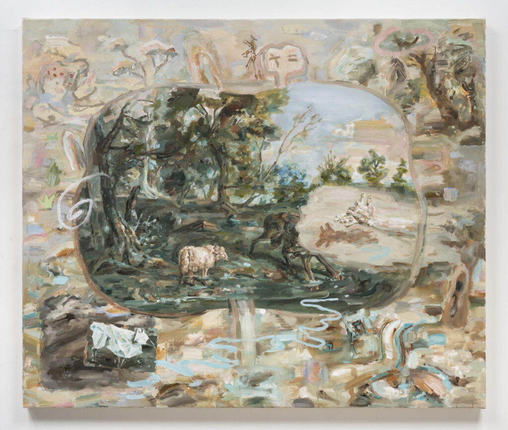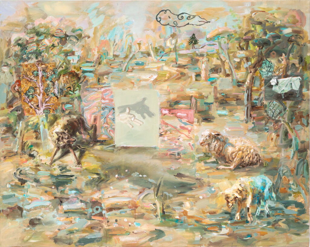 The Shepherd is Asleep/Le Loup et L’Agneau, 2024, acrylic on canvas, 54” x 80”
