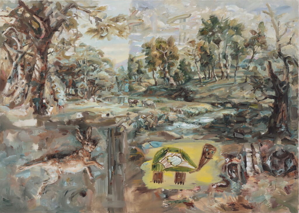 Reason Erosion After Oudry, 2025, acrylic on canvas, 47” x 56”